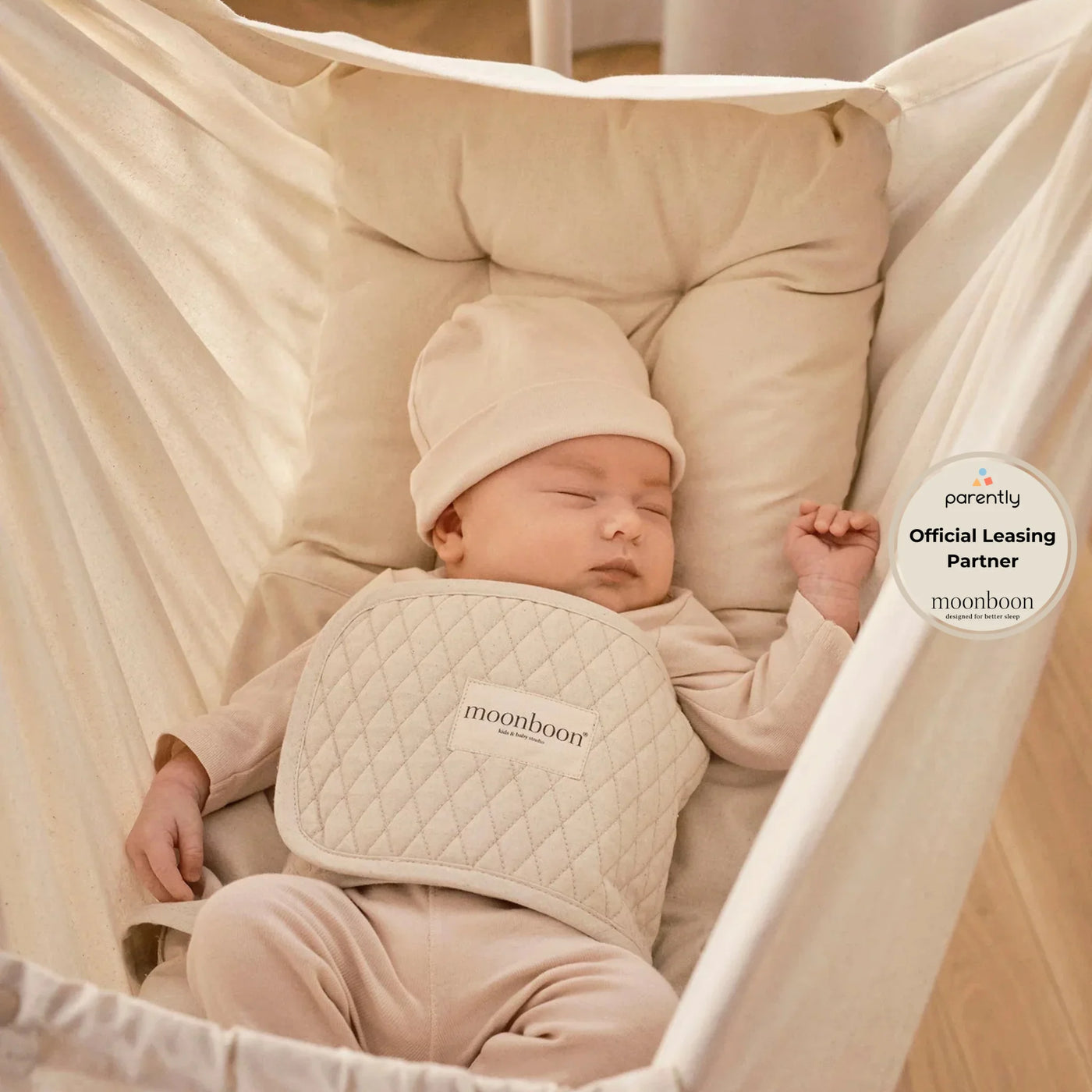 Absolutely! With the Fixi Mattress from Moonboon, your baby can sleep both safely and comfortably. While it's completely normal for a baby to move around a lot in their sleep, it can sometimes disrupt their sleep patterns. The Fixi Mattress is equipped with a luxurious, soft, quilted support belt that gently keeps your baby in the center of the mattress. It can help your baby stay more still and give you the peace of mind that your baby is sleeping safely. The mattress is compatible with Moonboon's cradle, baby hammock, and twin baby hammock.