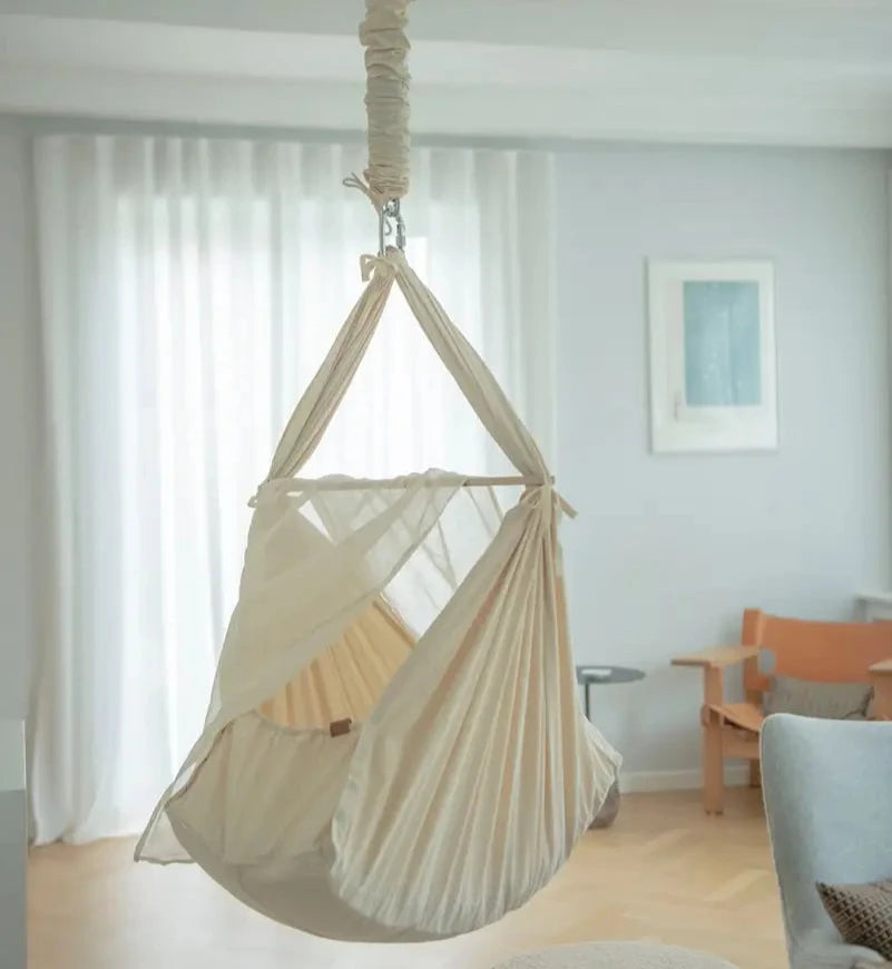 In this way, the baby will calm down and relax more quickly. The spring cradle is delivered complete with hanging cradle, spring, temperature-regulating wool mattress, sheets, hook, carabiner hook and canopy, and can be attached to a door frame, to the ceiling and to a stand. You can easily choose your desired type of fortress here.